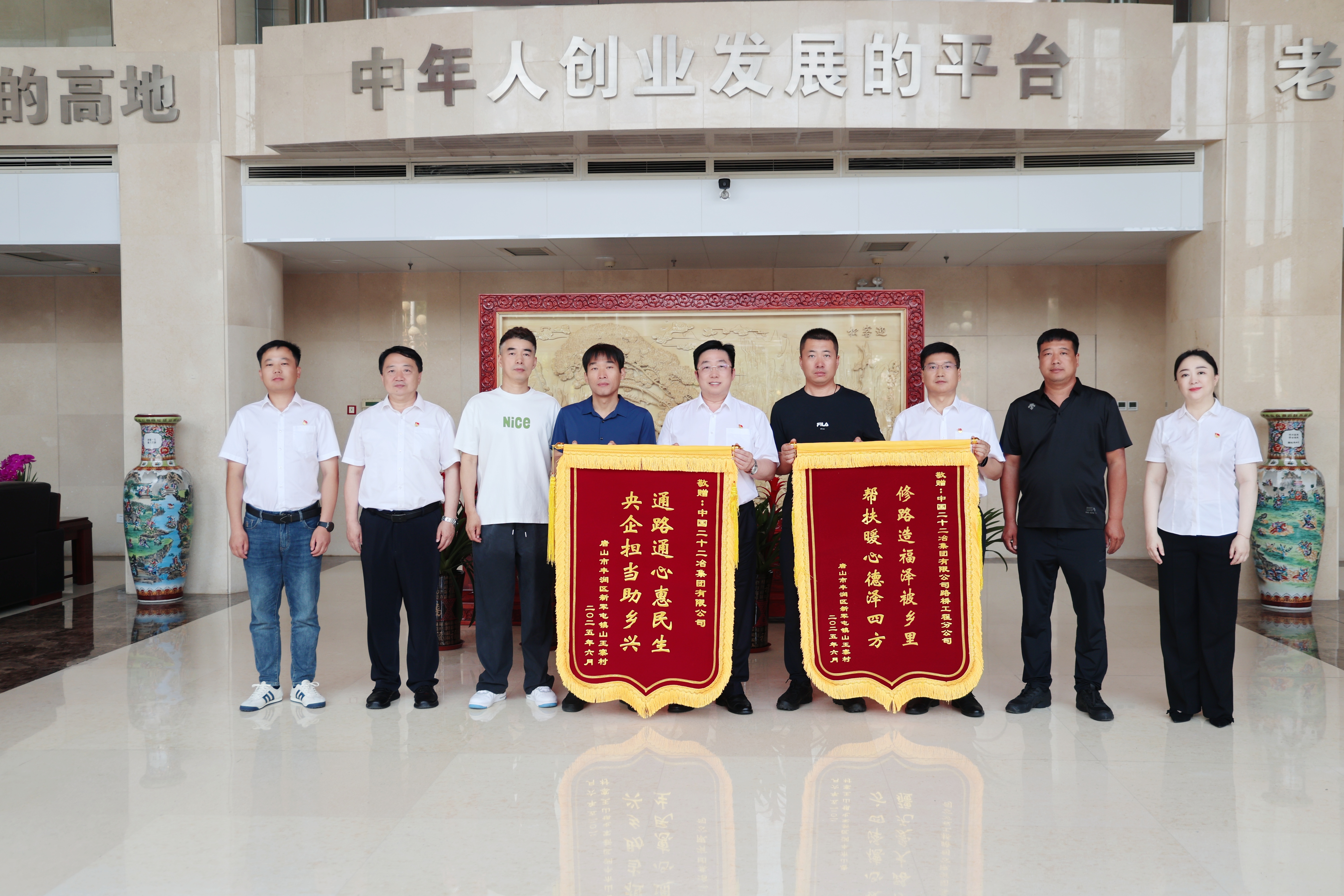 6月18日,唐山市總工會副主席付競楠一行來到中國二十二冶辦公大樓,將寫著“通路通心惠民生 央企擔(dān)當(dāng)助鄉(xiāng)興”和“修路造福澤被鄉(xiāng)里 幫扶暖心德澤四方”的兩面錦旗送到了公司領(lǐng)導(dǎo)手中,表達(dá)對中國二十二冶路橋分公司傾力幫扶的深深謝意。