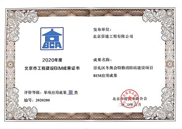 7月21日收到證書(shū),北京崇建公司“崇禮區(qū)冬奧會(huì)特勤消防站建設(shè)項(xiàng)目BIM應(yīng)用成果”被評(píng)為2020年度北京市工程建設(shè)BIM單項(xiàng)應(yīng)用成果Ⅲ類。