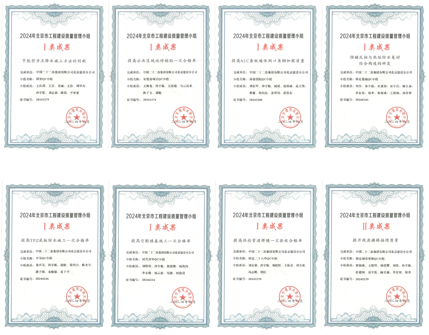 4月17日,在北京市建筑業(yè)聯(lián)合會組織的2024年度QC競賽活動中,崇建公司8項參賽成果全部入圍,最終獲得省部級一等獎7項,二等獎1項,時隔一年再次刷新了崇建公司在屬地化質量管理活動競賽中的最好成績,其中一等獎獲獎數(shù)量超過了以往屬地化競賽活動一類獎項的總和,成果總體水平提升明顯。