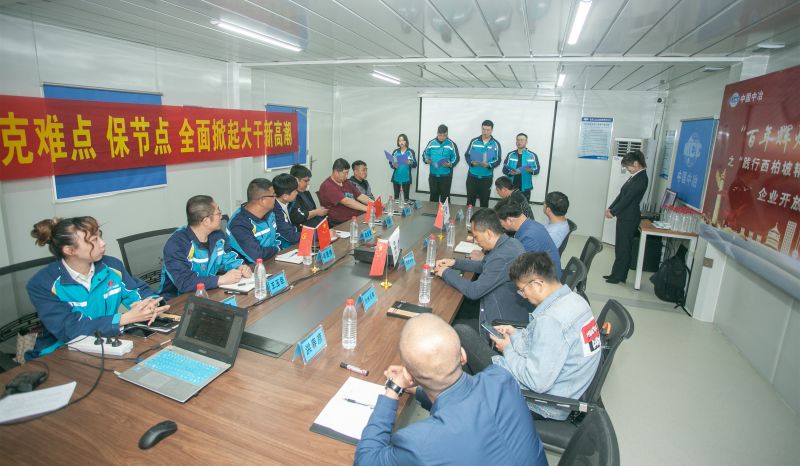 在“學(xué)黨史”環(huán)節(jié),通過“身臨其境學(xué)黨課”的方式講述了“選址西柏坡,新中國(guó)從這里走來”,緬懷革命先輩,不忘革命初心;項(xiàng)目青年團(tuán)朗誦詩(shī)歌《西柏坡精神頌》,展現(xiàn)項(xiàng)目青年員工積極向上、向黨靠攏的精神風(fēng)貌。在“悟思想”環(huán)節(jié),項(xiàng)目管理人員上臺(tái)宣誓,承諾在工作、生活中積極踐行“西柏坡精神”,建設(shè)人民滿意工程,造福滄州百姓;業(yè)主及項(xiàng)目管理人員在“抓重點(diǎn)、克難點(diǎn)、保節(jié)點(diǎn),全面掀起大干新高潮”條幅上簽字承諾。在“辦實(shí)事”環(huán)節(jié),項(xiàng)目經(jīng)理向青年突擊隊(duì)授旗,提高項(xiàng)目青年員工責(zé)任擔(dān)當(dāng)意識(shí),為項(xiàng)目各項(xiàng)工作開展提供強(qiáng)勁動(dòng)力;項(xiàng)目黨員干部、青年突擊隊(duì)隊(duì)員與協(xié)力隊(duì)伍人員及當(dāng)?shù)鼐用窠Y(jié)對(duì)幫扶,并發(fā)放志愿服務(wù)卡,全力以赴幫助他們解決生活、工作中遇到的問題。在“開新局”環(huán)節(jié),項(xiàng)目工程經(jīng)理帶領(lǐng)與會(huì)人員參觀施工現(xiàn)場(chǎng),介紹項(xiàng)目的工程概況、工程重難點(diǎn),以及建設(shè)過程中的感人故事,讓與會(huì)人員感受企業(yè)的綜合實(shí)力以及建設(shè)人民滿意工程的決心和信心。