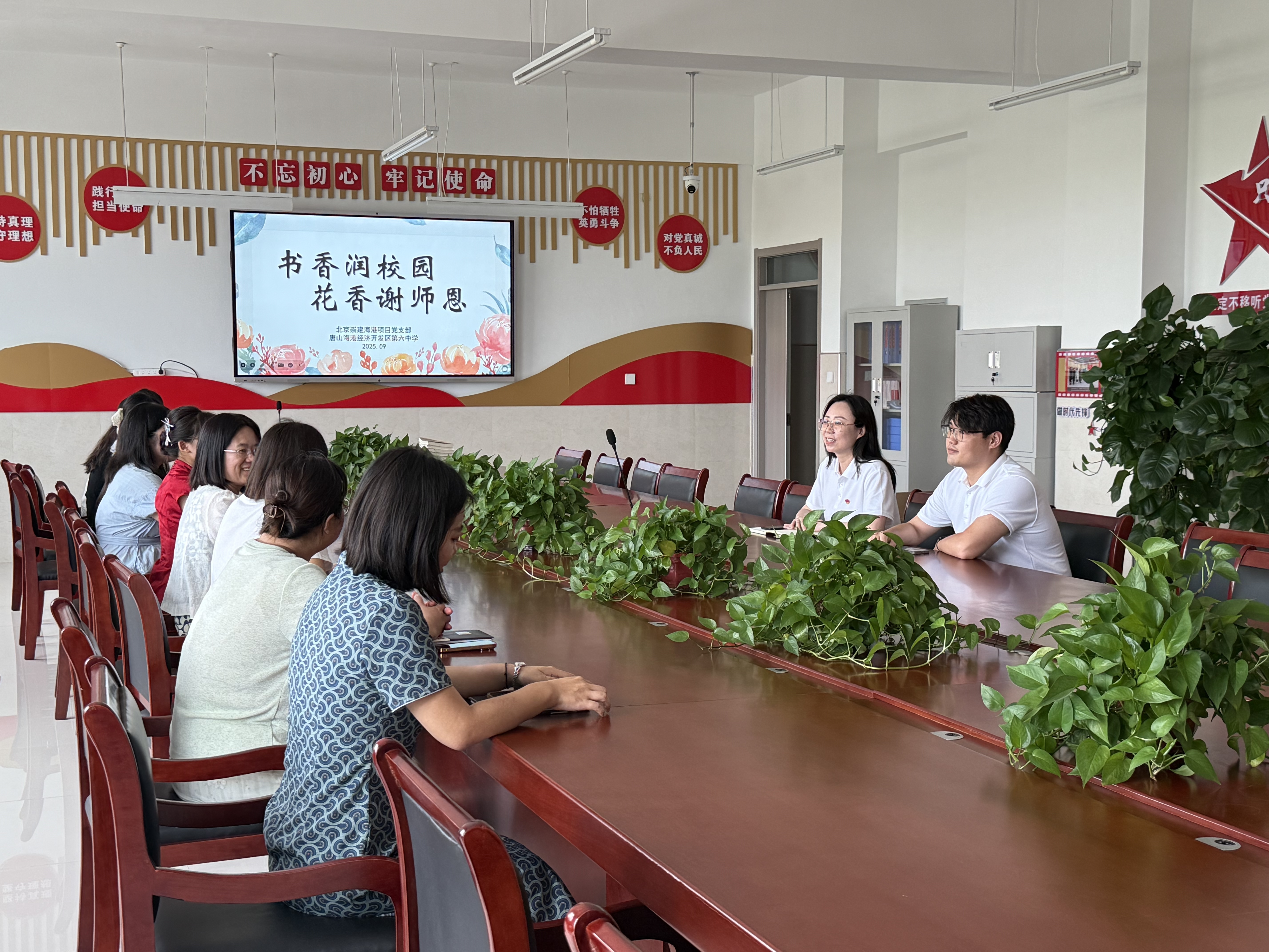 活動(dòng)現(xiàn)場(chǎng)暖意融融,首先,海港項(xiàng)目黨支部向海港第六中學(xué)捐獻(xiàn)項(xiàng)目圖書(shū)室部分圖書(shū),將精心挑選的一批圖書(shū)捐贈(zèng)給學(xué)校,這些圖書(shū)涵蓋偉人著作、黨員教育、文學(xué)經(jīng)典等多個(gè)品類,豐富師生的閱讀資源,讓 “書(shū)香” 真正浸潤(rùn)校園每一個(gè)角落。隨后,活動(dòng)進(jìn)入致敬優(yōu)秀環(huán)節(jié)。項(xiàng)目黨支部代表為學(xué)校被表彰的優(yōu)秀班主任獻(xiàn)上鮮花,鮮花象征著對(duì)教師們辛勤付出的認(rèn)可與敬意,也傳遞著校企雙方對(duì)教育事業(yè)的深切關(guān)懷。班主任代表上臺(tái)分享教育心得,既感謝海港項(xiàng)目黨支部對(duì)學(xué)校的支持,也堅(jiān)定表達(dá)了未來(lái)將繼續(xù)深耕三尺講臺(tái)、用心培育學(xué)生的決心,真摯的話語(yǔ)贏得現(xiàn)場(chǎng)陣陣掌聲?;顒?dòng)最后,海港第六中學(xué)趙春鳳校長(zhǎng)帶領(lǐng)參觀了黨員活動(dòng)室、名師工作室、少年軍校。每一處參觀場(chǎng)景,都讓雙方對(duì)彼此的工作有了更深入的認(rèn)知。