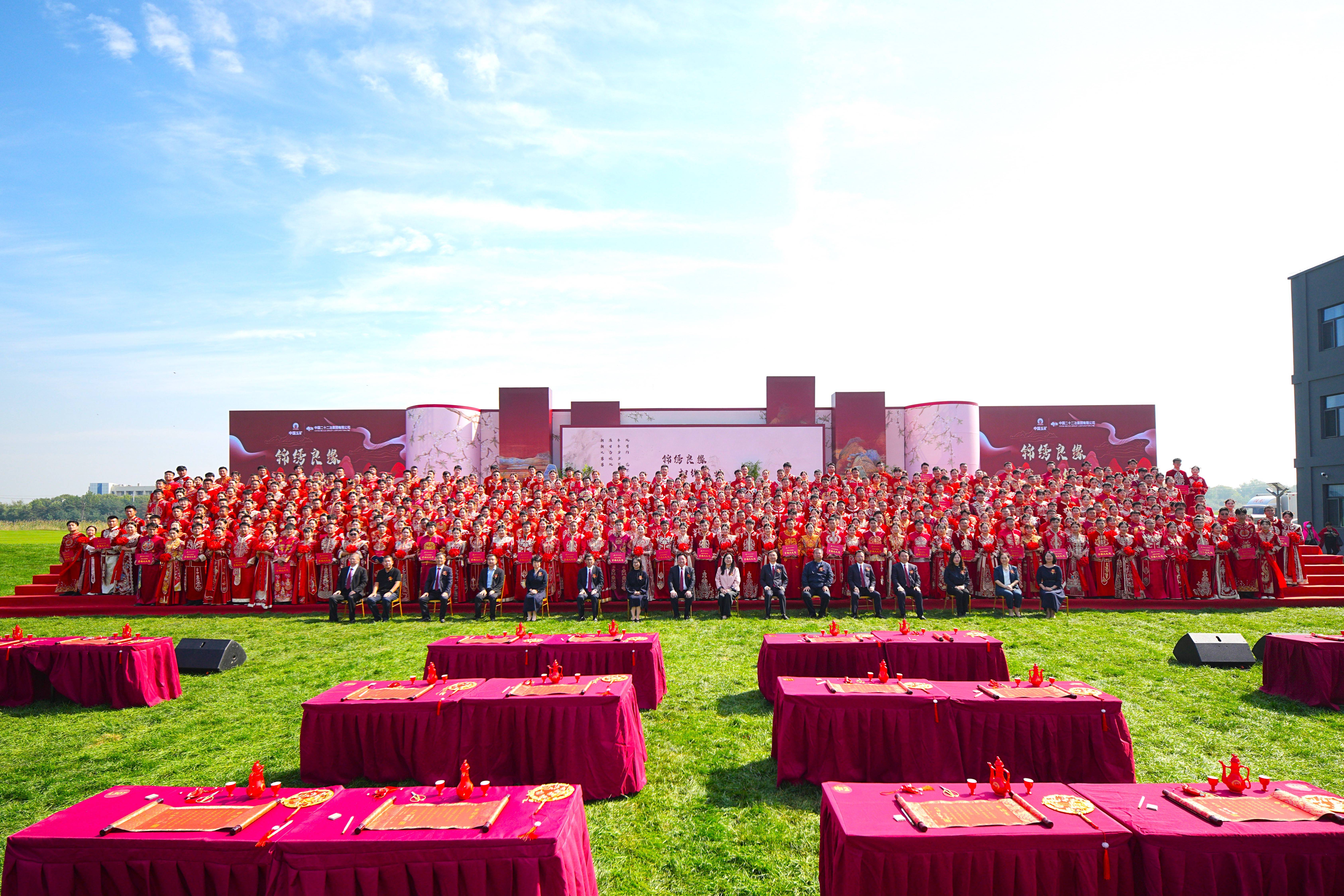 吉時已到,華燈初上。至親摯友歡聚一堂,共賀新禧,同證鴛盟。203對新人執紅綢相牽,踏錦毯徐行。新娘鳳冠流彩,團扇半掩芙蓉面;新郎紅袍玉帶,眉宇盡展英氣。八方賓客共睹此天作之合,百對新人同締山海之盟,滿座皆沐華夏婚儀之雅韻,共仰千年禮樂之風華。